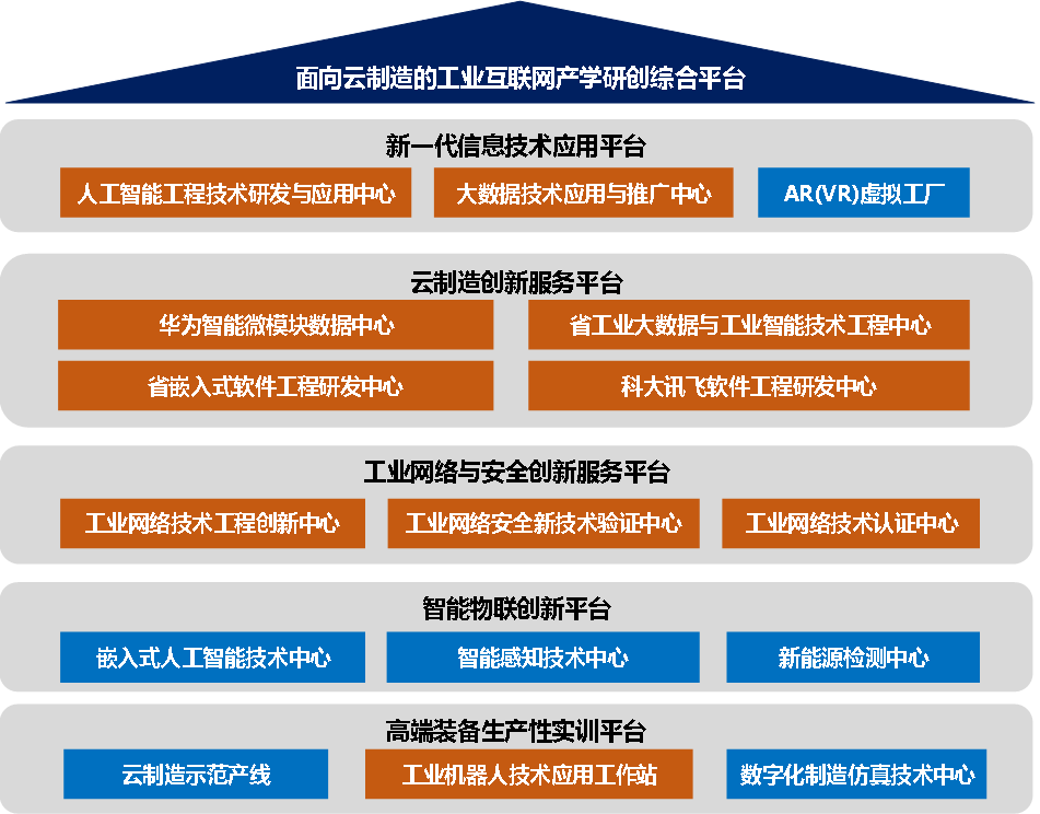 2.总体目标。围绕技术服务、人才培养、科技攻关、创新培育等要素,加强与常州市政府、工业互联网及智能制造等相关行业企业深度合作,按照工业互联网技术应用与服务、技术研发与创新、技术技能训练的逻辑主线,集聚公司现有资源,通过提升、改造、扩容和新建等方式,打造面向云制造的工业互联网产学研创综合平台。平台由新一代信息技术应用平台、云制造创新服务平台、工业网络与安全创新服务平台、智能物联创新平台、高端装备生产性实训平台等五个子平台组成(见下图)。平台将为公司工业互联网专业集群的人才培养、社会服务提供软硬环境和条件支撑,为江苏省乃至长三角地区先进制造业和工业互联网提供高端技术技能人才培养服务,为大中小制造企业的转型升级、技术攻关、产品研发、成果转化等提供各类公共技术服务。